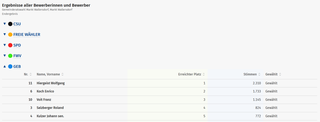 Neben dem Bürgermeister konnten auch die bisherigen Gemeinderäte Enrico Koch, Wolfgang Hiergeist, Franz Voit, Roland Salzberger und Hans Kulzer erneut in den Marktgemeinderat einziehen. Mit insgesamt fünf Sitzen stellt die Gruppierung damit weiterhin die stärkste Kraft im Gremium.