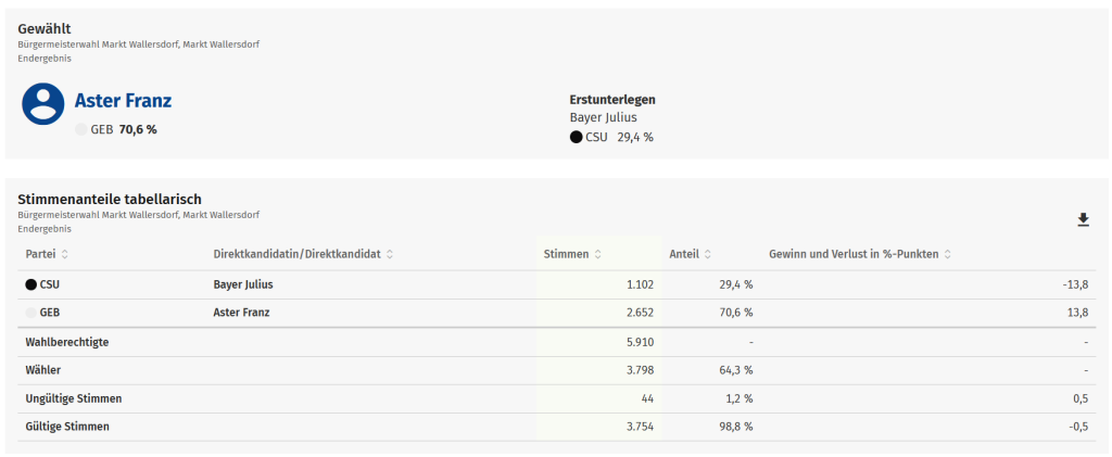 Die Bürgerinnen und Bürger von Wallersdorf haben entschieden: Franz Aster bleibt Bürgermeister. Bei der Kommunalwahl 2026 wurde er mit über 70 Prozent der Stimmen eindrucksvoll im Amt bestätigt – ein starkes Zeichen des Vertrauens und der Unterstützung aus der Bevölkerung.