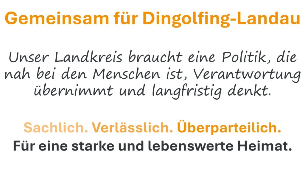 PRO Dingolfing-Landau steht für eine Politik, die zuhört, Verantwortung übernimmt und langfristig denkt. Der Landkreis braucht Entscheidungen mit Augenmaß, die heute wirken und auch morgen Bestand haben. Dabei setzt PRO bewusst auf Zusammenarbeit statt Konfrontation und auf Lösungen statt Schlagworte.
